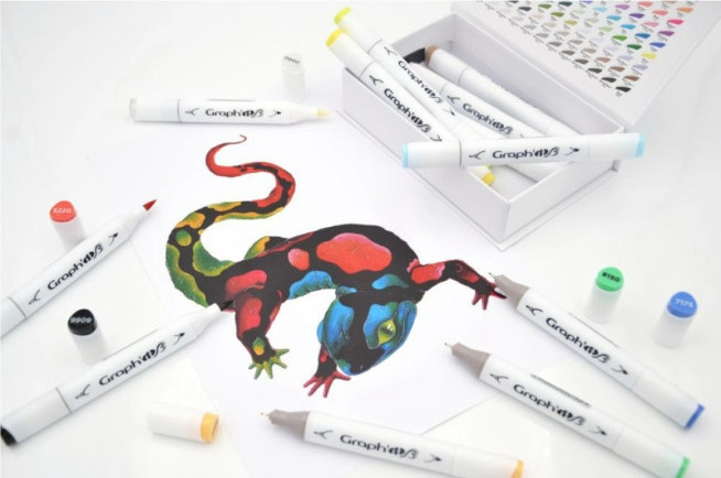 A GRAPH'IT BRUSH alkoholos marker ötvözi a kreatív rugalmasságot, a technikai precizitást, a könnyű használatot és a széles színválasztékot – így kiváló professzionális eszköz az igényes illusztrátorok számára. Egyedülálló hegykombinációt kínál: egy ecset hegy a kifejező vastag és vékony ecsetvonásokhoz, és egy 0,5 mm-es liner hegy a finom részletekhez és vonalakhoz.
