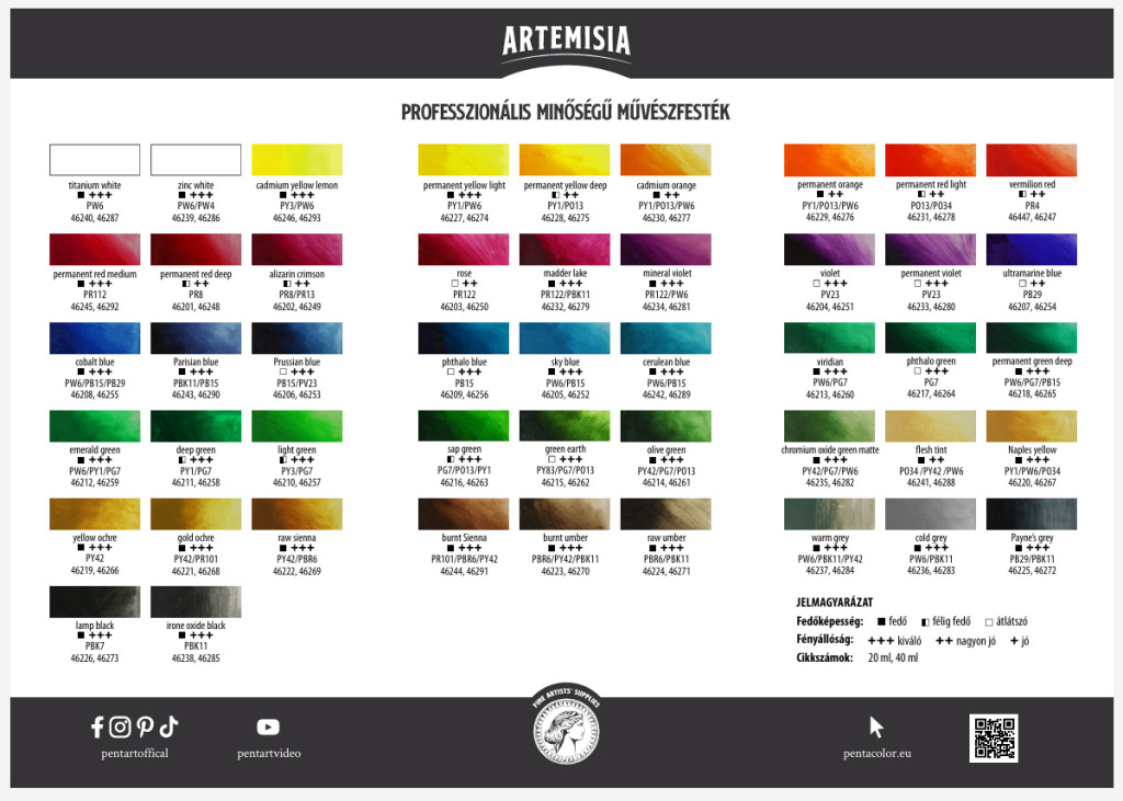 Az Artemisia olajfestékei magyar gyártásúak, professzionális minőségűek. Alkalmas például vászonra, fára, papírra is. Sűrű, krémes állaga miatt könnyen felvihető, lehetővé teszi az egyszerű rétegzést. Magas pigmenttartalma miatt a színek igazán erősek, élénkek, még vékony rétegben is. Jól keverhetőek egymással, így rengetegféle szín és színárnyalat létrehozható velük. Az Artemisia olajfestékei környezetbarátok, a gyártás során kerülték a nehézfémtartalmú pigmenteket, valamint minimalizálták az adalékanyagok használatát. Lassan szárad, érintés száraz néhány nap alatt lesz, de a teljes száradás 6-12 hónap is a rétegektől függően. 47 színben kapható.