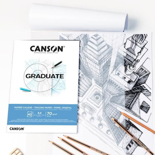 A Canson Graduate Tracing pauszpapír tömbje ideális gyakorlásra, vázlatozásra. Hasznos lehet tervezéskor, pl. lakberendezés, építészet, formatervezés, hiszen áttetsző, így segít a vázlatokból a kész tervet átrajzolni. Használható ceruzákkal, tollakkal is. Sima felületű, 70 g-os, erősen áttetsző, 40 lapos papírtömbök.