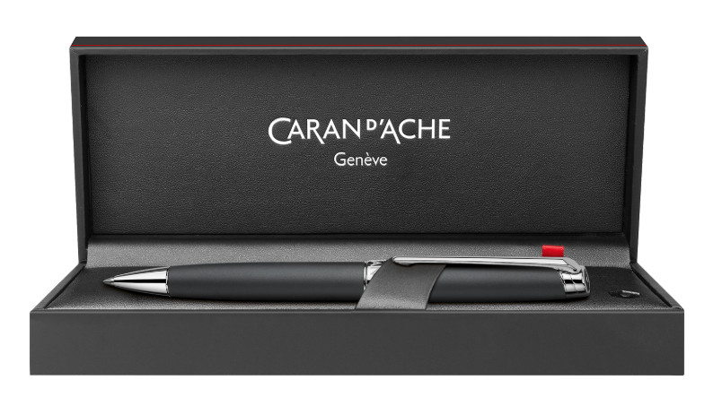 A Caran d'Ache Léman matt fekete golyóstoll igazán modern, divatos és elegáns. A részletek ezüst, ródiumozott fényessége gyönyörű kontrasztot ad a matt fekete tolltesttel. M-es méretű, fekete tollbetéttel ellátva, de bármely Caran d'Ache Goliath tollbetéttel kompatibilis.