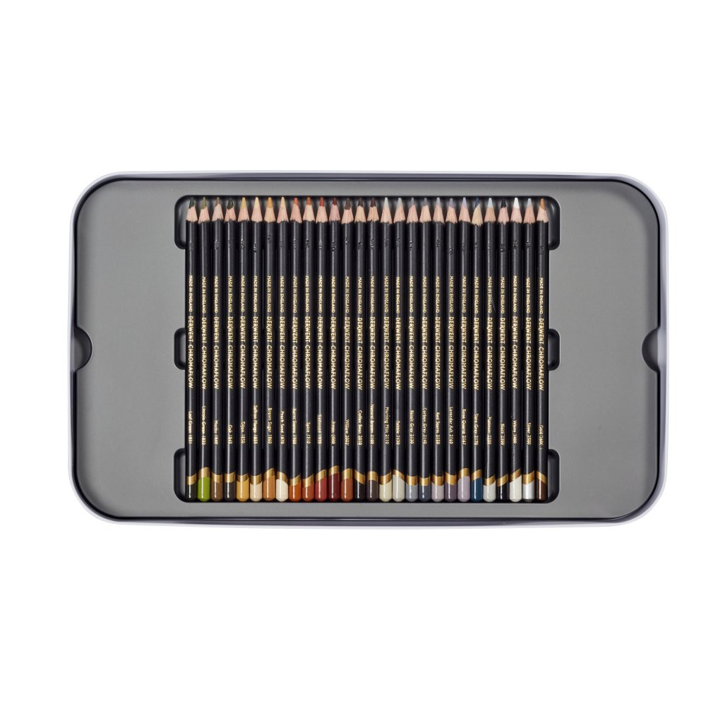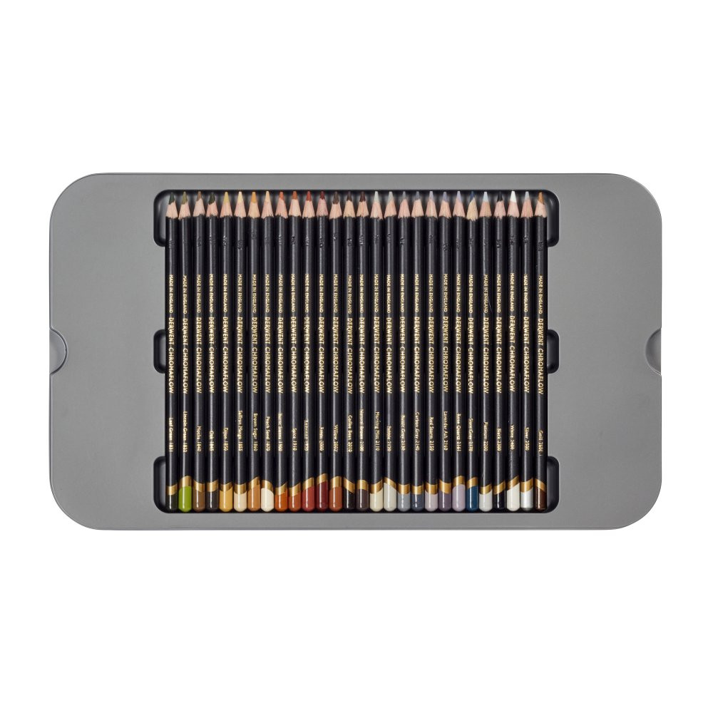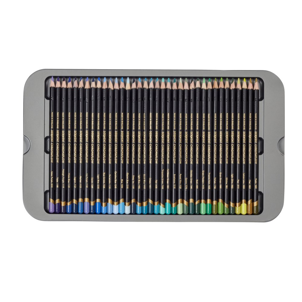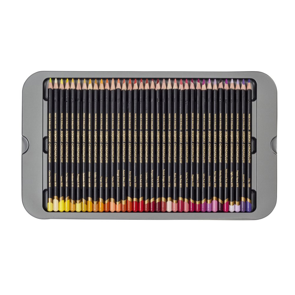 A Derwent Chromaflow színes ceruza puha, erősen pigmentált, amelynek hála vibrálóan mutat akár sötét papíron is. Krémes állaga miatt egységesen és gyorsan fel tudjuk vinni a papírra. Nehezen törik, könnyen keverhető, rétegezhető és árnyékoláshoz is tökéletes. Könnyebben radírhozató, mint más színes ceruzák, de teljesen azért ez sem visszaszedhető.