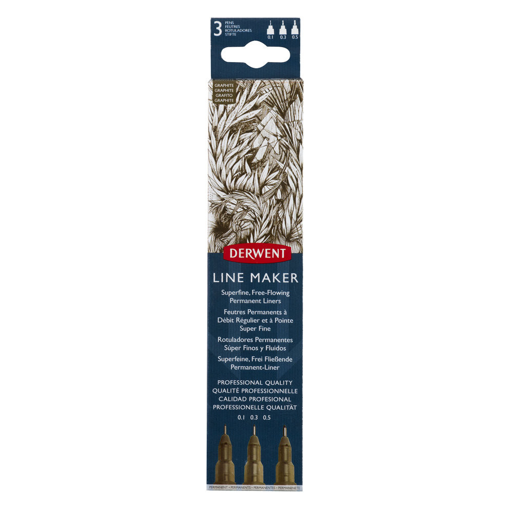 A Derwent Line Makerek finom hegyű tollak, amelyek egyenletes, sima, átlátszatlan vonalakat hoznak létre. Ideálisak rajzoláshoz és íráshoz egyaránt, tartós, gyorsan száradó pigmenttintát tartalmaznak, intenzív színnel, amely permanensre szárad.