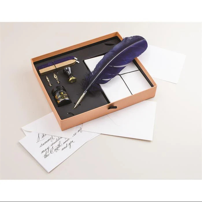 A Manuscript Quill készlete ideális kezdőkészlet levelezéshez, akár te szeretnél leveleket küldeni, akár ajándékba szánnád valakinek, aki imádja a hagyományos kalligráfiát! A csomagban találsz egy 'quill' madártoll tollszárat, amely alapvetően egy DP256-os rajzos tollszemmel van felszerelve, de ez cserélhető, a készletben még két másik tollszemre is válthatod! Az íráshoz találsz még benne egy 25 ml-es fekete kalligráfia tintát és hozzá 6 db borítékot és levélpapírt. A megírt leveleket pedig a pecsétviaszok segítségével zárhatod le!