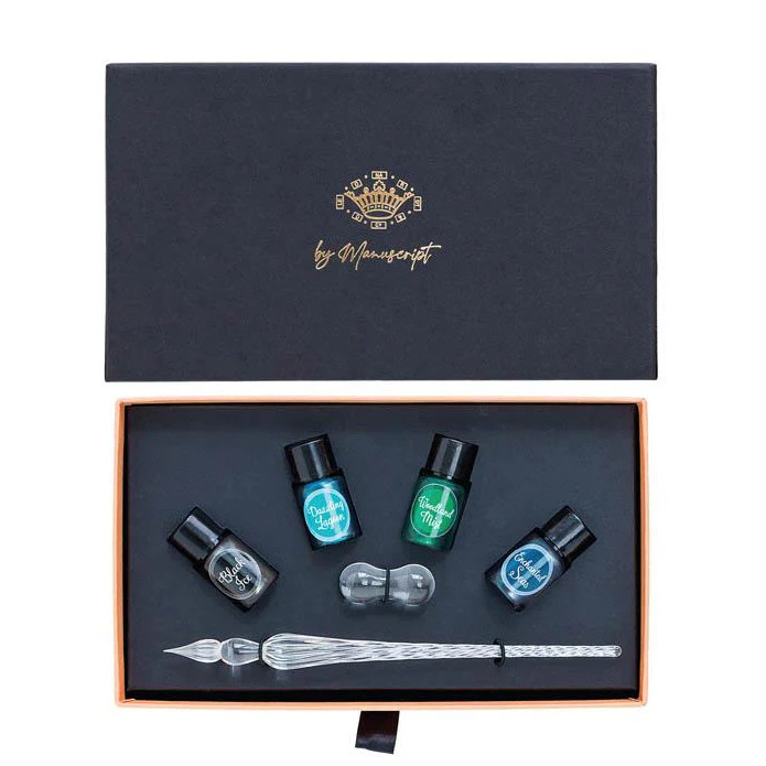 A Manuscript Victoria kalligráfia készlete igazán különleges és elegáns, akár ajándéknak is tökéletes választás a kalligráfia szerelmeseinek! A készletben található egy üveg mártogatós toll és hozzá egy támasz, valamint 4 db 7 ml-es ShimmerInk csillogó tinta (Black Ice, Dazzling Lagoos, Woodland Mist és Echanted Seas színekben).