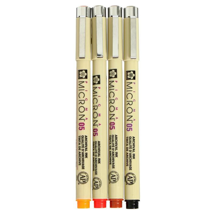 A Sakura Pigma Micron Van Gogh Museum készletben 4 db különböző színű 05 vastagságú liner található; narancssárga, piros, barna és fekete árnyalatokban.