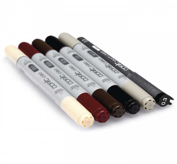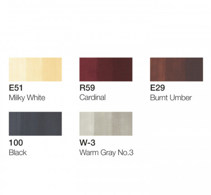 • a készlet 5  különböző színt (E51, R59, E29, 100, W-3) , valamint egy  fekete Copic Multilinert tartalmaz (0.3 mm)