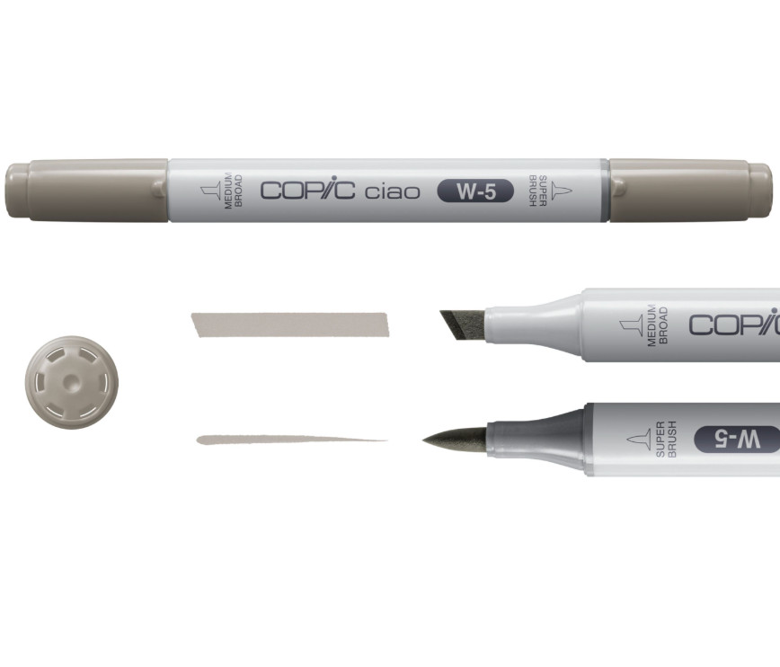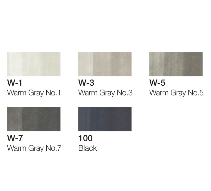 A készlet 5 db Copic Ciao markert (W1- Warm Grey no.1, W3- Warm Grey no.3, W5- Warm Grey no.5, W7-Warm Grey no.7, 100- Black), és egy darab fekete Copic Multilinert (0.3 mm) tartalmaz.