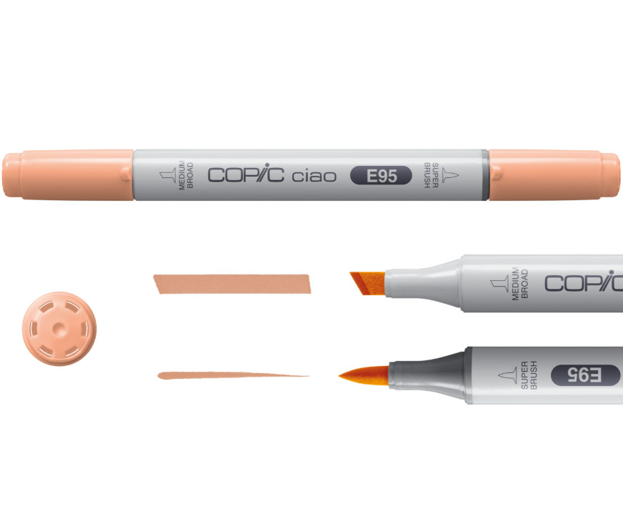 A Ciao széria 180 színben érhető el, egy ecsetvégű és egy közepes vágott heggyel. Kiváló minőségű ecsethegye puha és hajlékony, így rengetegféle vonalvastagsághoz alkalmas, míg vastagabb vágott vége tökéletes precíz, egyenes vonalakhoz, valamint nagyobb felületekhez  színezéséhez is. A Copic Ciao markerek tervezésénél a megfizethetőség volt a fő szempont, ezt a markerek testének kialakításával érték el, a tintájuk és a hegyük minősége viszont maradt az eredeti Copic kiválósága.