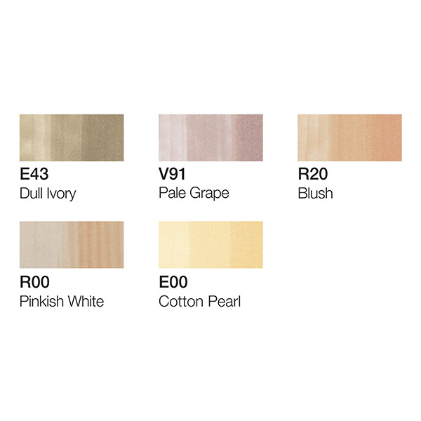 A készlet 5 db Copic Ciao markert (E43- Dull Ivory, V91- Pale Grape, R20- Blush, R00- Pinkish White, E00- Cotton Pearl), és egy darab fekete Copic Multilinert (0.3 mm) tartalmaz.
