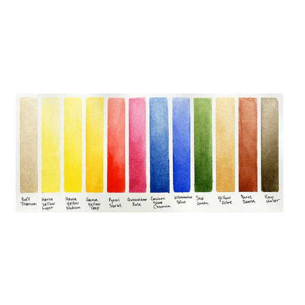 A készletben található színek; Buff Titanium, Hansa Yellow Light, Hansa Yellow Medium, Hansa Yellow Deep, Pyrrol Scarlet, Quinacridone Rose, Cerulean Blue, Chromium, Ultramarine Blue, Sap Green, Yellow Ochre, Burnt Sienna, Raw Umber.