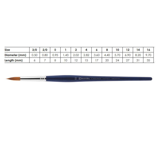 Az Escoda ecsetek egyik legújabb változata a Chronos széria, amely ideális nem csak akvarellhez, hanem akrilhoz is. Különlegessége, hogy kevert szálakból készült, 90%-ban arany Toray szintetikus szálakból, 10%-ban pedig vörösnyest természetes szőrből. Ezáltal finom egyensúlyba került az ecsetek erőssége és hajlékonysága. A természetes szőr segít abban, hogy több vizet és festéket tudjon magában tartani, míg a szintetikus szálak biztosítják a hajlékonyságát és formatartását.