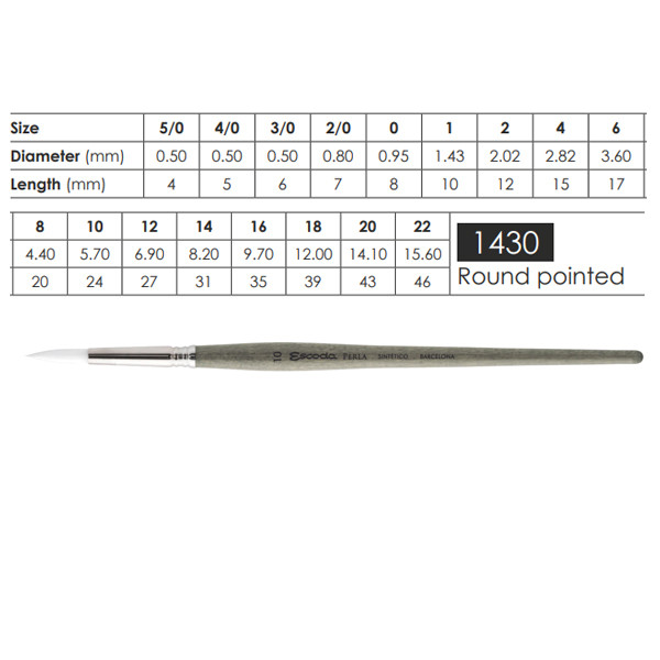 Az Escoda Perla szériájú ecsetei White Toray szintetikus szálakból készült. Ezek az egyik legpuhább szintetikus szálak, amelyeket főként akvarellfestéshez használnak. Kiváló minőségűek, rugalmasak és formatartóak. A kerek ecset három különböző átmérőjű és hosszúságú szálból áll, így is biztosítva a hegyességét. Ideális igazán változatos vonalvastagság elérésére. Tökéletes választás kezdőknek és profiknak is.