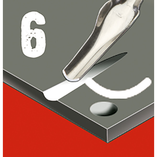 No. 5 - Az ötös számú kés egy kicsit különbözik a többitől. Ezt főként vékony vonalak megjelölésére használják, főként a tényleges metszés elkezdése előtt, hogy meghatározzák a design-t, és eltávolítsák a szükségtelen hátteret. Könnyen lehet húzni, és tolni is, akár hullámos vonalakhoz is. Kicsit mélyebbre vágva, pedig igazán hasznos, ahhoz hogy megjelöljük milyen mélyre szeretnénk kimetszeni a képet.