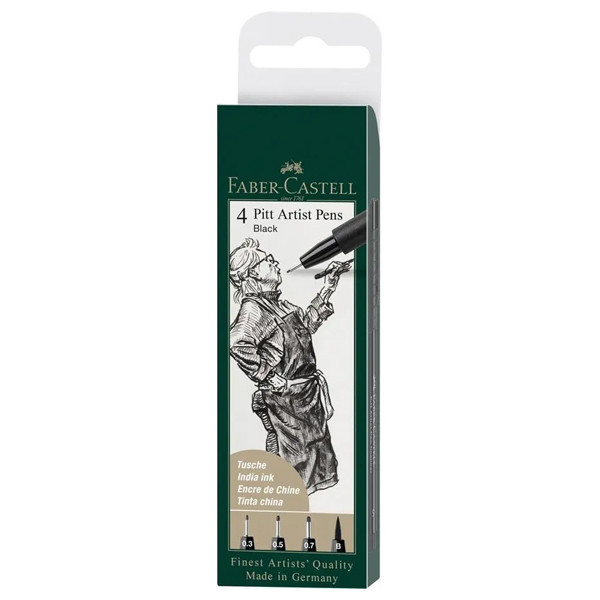 A Faber-Castell egyesítette minden előnyét a művész tusnak és a modern, könnyen kezelhető filctollnak a Pitt Artist markereiben. A készletben 3 darab tűfilcet és egy darab ecsetfilcet találsz. Az ecsetfilc vége hajlékony, azonban strapabíró, tartja a formáját. A tűfilc pedig tökéletes választás a részletek kidolgozására, kontúrok rajzolására. Száradás után vízálló, permanens lesz.  A gazdagon pigmentált és erősen fényálló tus ideális vázlatokhoz, rajzokhoz, tanulmányokhoz, divattervezéshez és illusztrációkhoz. Hosszú élettartam jellemzi. Szagtalan, savmentes.