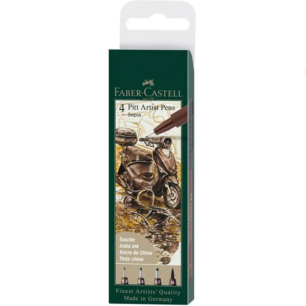 A Faber-Castell egyesítette minden előnyét a művész tusnak és a modern, könnyen kezelhető filctollnak a Pitt Artist markereiben. A készletben 3 darab tűfilcet és egy darab ecsetfilcet találsz. Az ecsetfilc vége hajlékony, azonban strapabíró, tartja a formáját. A tűfilc pedig tökéletes választás a részletek kidolgozására, kontúrok rajzolására. Száradás után vízálló, permanens lesz.  A gazdagon pigmentált és erősen fényálló tus ideális vázlatokhoz, rajzokhoz, tanulmányokhoz, divattervezéshez és illusztrációkhoz. Hosszú élettartam jellemzi. Szagtalan, savmentes.