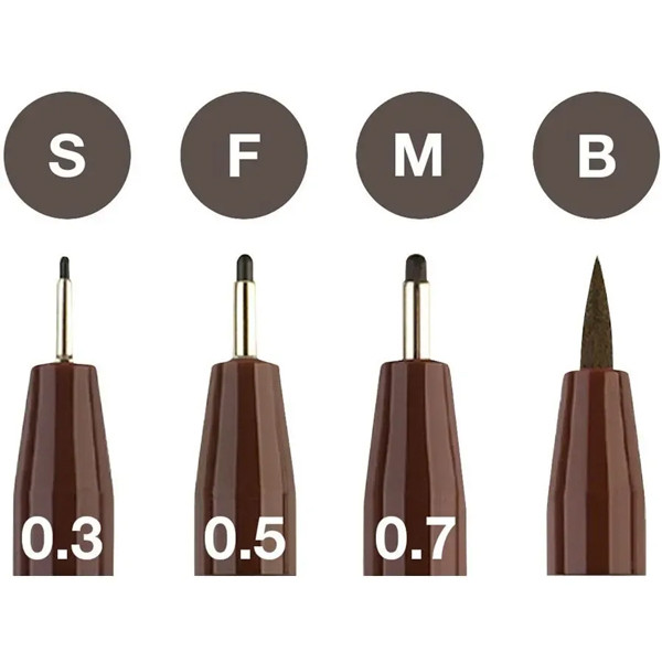 A készlet tartalma, 3 db fekete tűfilc (S: 0.3 mm, F: 0.5 mm, M: 0.7 mm) és 1 db ecsetfilc szépia színben.