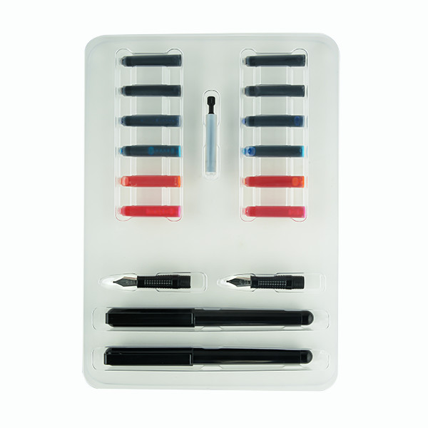 A Manuscript kalligráfia kezdőkészletében mindent megtalálsz, ami az elinduláshoz szükséges, ha vágott végű kalligráfiát szeretnél megtanulni. A készletben találsz 2 töltőtoll testet, és 4 különböző méretű tollhegyet hozzájuk, amelyekkel könnyen gyakorolhatod a különböző stílusokat. A tanuláshoz és a betűtípusok bemutatásához segítségedre lesz a 20 oldalas, angol (és francia) nyelvű oktatófüzet. Hasznos kiegészítőként pedig találsz még a készletben 12 db színes tintapatront és egy A5-ös méretű gyakorlótömböt is.