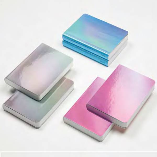 Prémium jegyzetfüzet. A holografikus borítás a mozgás és fény hatására változtatja színét. Az irizáló felület műbőrből készült.