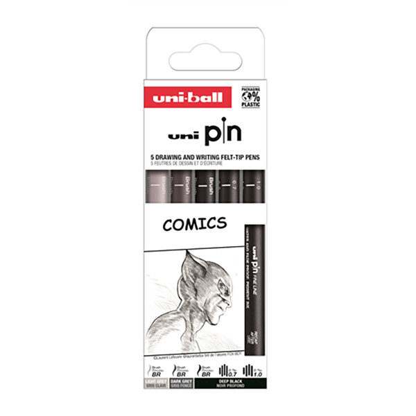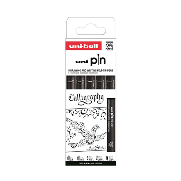 Az UNI Pin műszaki tűfilcei, és vágott végű filcei száradás után fény- és vízállóak lesznek, így kiváló választás akár akvarellhez is. Ezt a készletet kifejezetten kalligráfiához állították össze. A készlet 2 tűfilcet (0.1 és 0.5) és 3 darab vágott végű filcet tartalmaz (1.0, 2.0 és 3.0). A tűfilc ideális lehet díszítésre, rajzolásra. A vágott végű filcek ideálisak szögletesebb, gótikus stílusú betűk írására.